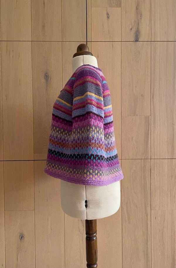 Every size, from 36-54, has it's own (depth of) yoke and colourwork, so that the shape as a whole remains well balanced. Every row is included in a colour chart. The pattern is written in detail. It is written in English and Dutch.